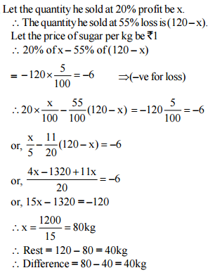 6. A shopkeeper has 120 kg sugar. He sells a certain amount of sugar at 20% profit and the rest at 55% loss. In the whole process his loss is 5%. Find the difference between the amount of sugar he sold at 20% profit and the amount he sold at 55% loss.