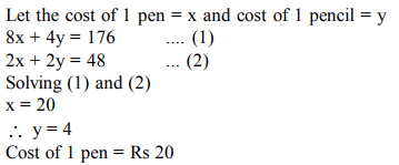 5. The cost of 8 pens and 4 pencils is `176 and the cost of