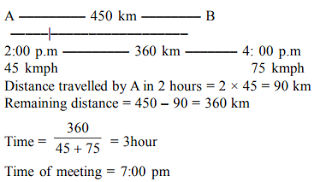 5. A and B are two stations 450 km apart. A train starts from station A at 2:00 pm and travels towards B at the speed of 45 km/hr. Another train starts from station B at 4:00 pm and travel towards A at the speed of 75 km/hr. At what time will they meet?