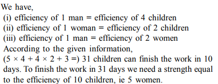 4. Five men, four women and three children can complete a work in 10 days. A man does double the work a woman does and a child does one-fourth the work a man does. How many women can complete the work in 31 days?