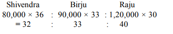 5. Shivendra started a business investing Rs 80,000. After three months Birju joined him with an amount of Rs 90,000 and after another three months Raju joined him with an amount of Rs 1,20,000. Profit earned at the end of three years from the time Shivendra started the business should be distributed in what ratio among Shivendra, Birju and Raju respectively?
