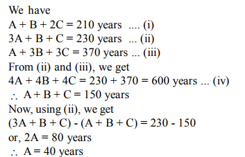 8. If the ages of A and B are added to twice the age of C, the total becomes 210. If the ages of B and C are added to thrice the age of A, the total becomes 230. And if the age of A is added to the thrice the age of B and thrice the age of C, the total becomes 370. What is the age of A?