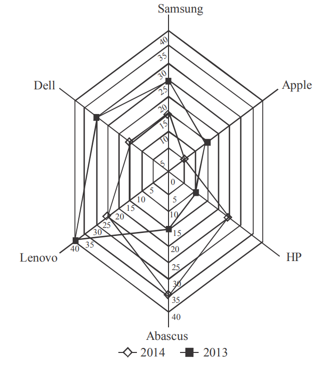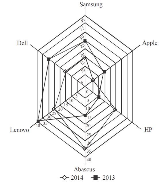 9. The difference between the number of laptops manufactured by Apple, Lenovo and Samsung in 2013 and that by Dell, HP and Abascus in 2014 is