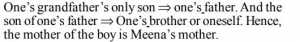 - Pointing to a boy, Meena says, “He is the son of my grandfather’s only son.’’ How is the boy’s mother related to Meena?
