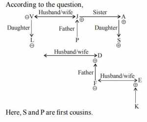 - Which of the following pairs of people represent first cousins with regard to the relations given in the expressions, if it is provided that A is the sister of J : ‘L > V < J + P’ and ‘S × A < D + F < E + K’