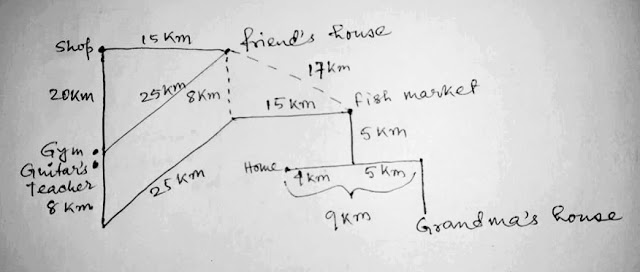 Suman starts walking from his gym. He walks to the north for 20km and reaches to a shop where he buys some vegetables. Then he takes right turn and walks for 15km and reaches his friend's house where he spends some time and then starts walking to the North-West for 25km and meets with his guitar teacher. From there he walks to the south for 8km and decides to go to the North-East. After walking 25km again he takes right turn and walks for 15km to reach fish market. From there he takes another right turn and walks for 5km and then goes to the right direction and walks 4km to reach his home. But then he suddenly changes his mind,turns around and starts walking straight to the east direction for 9km and then takes another right direction and reaches his grandma's house.