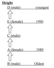 | Solutions -The given statements have to be understood as follows; 'A is taller than only B' means that A is taller than B but shorter than C, D and E. 'E is shorter than only D' indicates that D is the tallest and E is the second tallest. As the order of height and that of age are reverse to each other, tallest person is the youngest person and the shortest person is the oldest. | ||