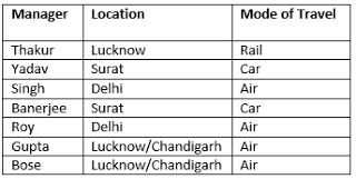 Thakur, Yadav, Singh, Banerjee, Roy, Gupta and Bose are to conduct interviews simultaneously either alone or in pairs at four different locations- Surat, Chandigarh, Delhi and Lucknow. Only one wants to travel by rail, two prefer travelling by car and the rest travel by air. Thakur is going to Lucknow but neither by car nor by air. Yadav prefers to travel by car. Neither Gupta nor Bose is going to Delhi. Only those going to Surat travel by road. Banerjee will assist his friend Yadav. The two managers who go to Delhi travel by air.