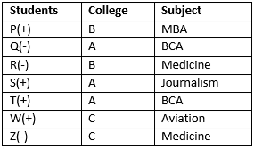 P, Q, R, S, T, W and Z are seven students studying in three different institutes – A, B and C. There are three girls among the seven students who study in each of the three institutes. Two of the seven students study BCA, two study medicine and one each studies Aviation Technology, Journalism and MBA. R studies in the same college as P, who studies MBA in college B. No girl studies Journalism or MBA. T studies BCA in college A and his brother W studies Aviation Technology in college C. S studies Journalism in the same college as Q. Neither R nor Z studies BCA. The girl who studies BCA does not study in college C.