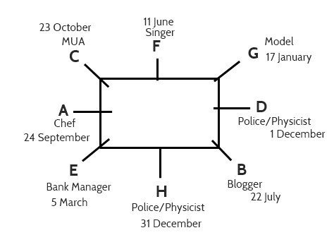 There’re eight friends A,B,C,D,E,F,G,H are sitting in a square table, four of them are at the corner and rest are in the middle of the table. They are of different professions: Police Officer , Model, Chef, Makeup Artist, Blogger, Physicist, Singer & Bank Manager. They were born in same year but on different dates: 17th January, 5th March, 11th June, 22nd July, 24th September, 23rd October, 1st December, 31st December ; but not necessarily in the same order. B is not facing H who’s facing the person who was born on 11th June. Neither E nor the Makeup Artist is D's neighbour. There’s only one person between B & E. B is senior to A & C, but they are not the junior most. The chef was born on an even numbered date. G is facing E. There’re two people between H & C. The Bank Manager is on the third left of the person who is facing the Chef. A is not facing E's neighbour. The Makeup Artist is one of the neighbours of the Chef. The person who was born on 31st December is facing the Singer who is the neighbour of the Model. E is only junior to G. A is facing the person who was born on 1st December. C is the makeup artist. There is one person between the Police officer& the Physicist. The Chef is sitting at the middle.