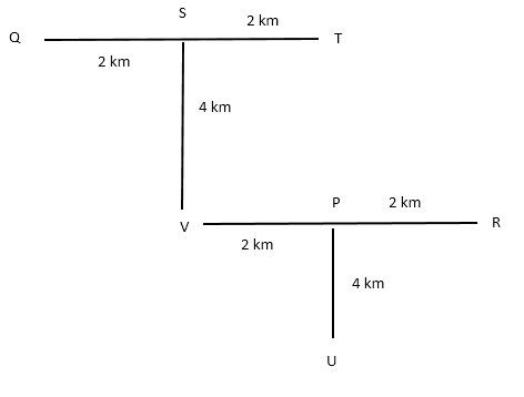 Q. (1-2) - Seven flats P, S, Q, V, R, U ad T are situated in an area. T is 4 km to the east of Q. U is 4 km to south of P. R is 2 km to east of P. S is 4 km to the north of V. V is 4 km to the west of R. S is 2 km to the west of T.