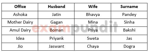 Jatin, Boman, Gagan, Jaswant and Priyank are married to Chaya, Bhavya, Mina, Priya and Sweta, not necessarily in the same order. These five couples run five different offices in Delhi namely Idea, Ashoka, Jio, Mother Dairy and Amul Dairy, again not necessarily in the same order. They also have different surnames i.e. Jas, Bakshi, Dogra, Pandey and Sinha, not necessarily in the same order. Match the details-