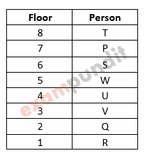 Eight friends namely P, Q, R, S, T, U, V and W live on separate floors of a building of 8 floors. The ground floor of the building is numbered 1 and the topmost floor is numbered 8. Only four people live between V and T. T lives on an even numbered floor. Only two people live between Q and W. W lives on one of the odd numbered floor below the floor on which T lives. P lives on one of the floor above Q. S lives on one of the floor above U. W lives on one of the floor above Q. Only one person lives between U and S.