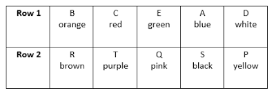 Ten persons are sitting in two parallel rows containing five in each. In row 1- A, B, C, D and E are seated, not necessarily in the same order and all of them are facing south. In row 2- P, Q, R, S and T are seated, not necessarily in the same order and all of them are facing north. Row 1 faces Row 2. Each of them likes different colors i.e. brown, white, red, black, pink, blue, green, purple, yellow and orange. These are the further details-