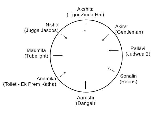 - Judwaa 2 is related to Tubelight in a certain way and Gentleman is related to Toilet - Ek Prem Katha in the same way based on the seating arrangement. Then which of the following is Raees related to following the same pattern?