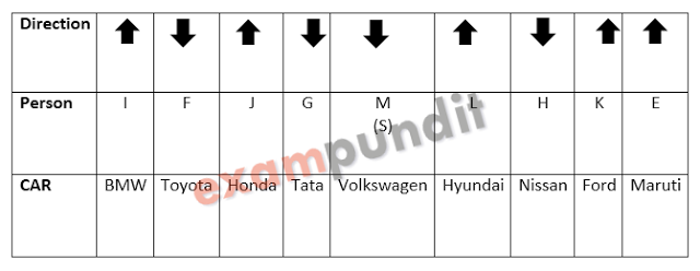 Nine persons E, F, G, H, I, J, K, L and M are sitting in a row facing in either south or north direction, not necessarily in the same order. They prefer to drive different cars as Hyundai and others. These are the further details. H and E are immediate neighbours of K but face in opposite directions to each other. M who drives Volkswagen sits in the middle of the row and his nick name is S. G and F faces in the same direction. The person who drives Tata sits to the immediate right of a person facing in North direction. F sits three places away from M. The person sitting at first and last position from left face in North direction and they drive BMW and Maruti respectively. The person drives Nissan sits to the immediate right of L. H doesn’t sit with M. I sits second to the left of J but doesn’t drive Maruti. J sits exactly between G and F. Also, there is only one person sitting between G and F. L and K faces in the same direction. The person drives Ford sits fourth to the left of the person drives Tata but neither of them is F. The person drives Toyota and Honda are sitting adjacent to each other. S faces towards south. The person drives Honda sits forth to the right of H.