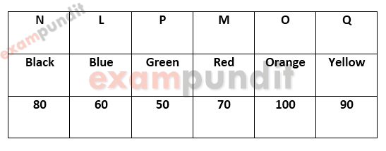 Six persons L, M, N, O, P and Q went to eat pizza. They contribute different amounts i.e. 50, 60, 70, 80, 90 and 100, not necessarily in the same order. They also like different colours i.e. Yellow, Red, Black, Blue, Orange and green not necessarily in the same order. They are seated in a row facing north. These are the further details, L sits to the left of M. The one who likes Blue is to the immediate left of P. The one who likes Green contribute 50. The neighbors of O contribute 70 and 90. Q sits at one of the ends. The one who likes Blue is four places away from the one who contributes 90. There is a gap of two seats between L and O. Neither P nor N is a neighbor of O. O did not contribute the least amount. The one who likes Black is third to the left of the one who contribute 70. N contribute more than L. The one who likes orange contributes the maximum amount. Q likes Yellow.