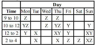 There are three brothers X, Y and Z. All of them work in the same company. They work in the office at different times on different days. X works in the office from 12 noon to 4 pm on Tuesday, Thursday and Sunday. His younger brother Y works in the office on Monday, Thursday, Friday and Sunday from 10 am to 2 pm. The eldest brother works in the office from 9 am to 12 noon on Monday, Wednesday and Thursday and between 2 pm and 4 pm on Friday, Saturday and Sunday.