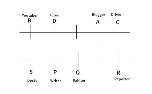 Eight people A, B, C, D, P, Q, R, S are sitting in two rows in such way a that A, B, C, D are sitting in a row facing in south direction in front of the row where P, Q, R, S are sitting facing them. In every row there are five seats. No vacant seat is at the extreme end or facing each other. They are of different professions: Driver, Blogger, Reporter, Writer, Youtuber, Doctor, Painter, Actor ; but not necessarily in the same order. Q is not at the extreme right end. The writer is facing the person who is on the third right of C. Only one person is sitting between the Actor & the Driver. The Reporter is facing the Driver. B is the Youtuber facing the neighbour if the writer. S is neither the Writer nor the Blogger. Only one person is between S and the Painter. The Painter and the Reporter are neighbours. D is facing P.