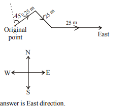 9. Neeraj is facing north, then he turns 45 degree right and goes 25 m, then turns in south – east direction to move 25 m and from there 25 m to east. In which direction/place is he from his original place?