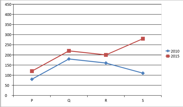 The following bar graph represents 4 colleges P,Q,R & S with their number of students for the years 2010 and 2015.