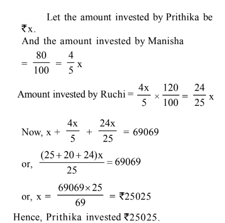 1. Ruchi invested 20% more than Manisha. Manisha invested 20% less than Prithika. If the total sum of their investments is Rs. 69069 then what amount did Prithika invest?