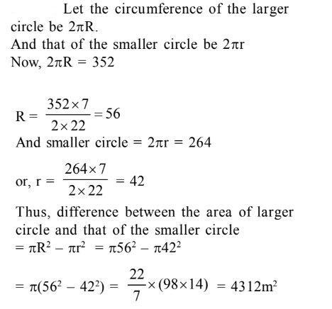 2. The circumferences of two circles are 264 metres and 352 metres respectively. What is the difference between the area of the larger circle and that of the smaller circle?