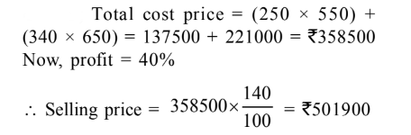 4. Victor purchased 250 shirts and 340 trousers at the rate of Rs. 550 and Rs. 650 respectively. What should be the selling price of the shirts and trousers so that 40% profit could be earned?