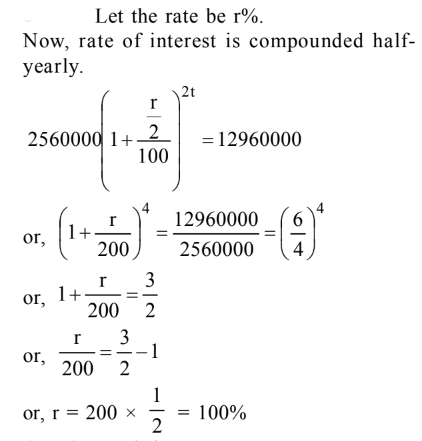 5. An amount of Rs. 2560000 becomes Rs. 12960000 in 2 years, if the interest is compounded half-yearly. What is the rate of compound interest?