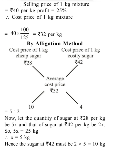 7. How many kilograms, of sugar at Rs. 42 per kg should a man mix with another 25 kg of sugar at Rs. 28 per kg so that he may gain 25% profit by selling Rs. 40 per kg?