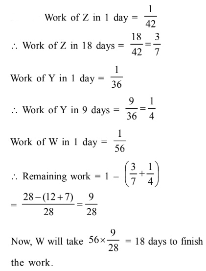 8. Z can do a piece of work in 42 days. Y can do the same piece of work in 36 days. W can do it in 56 days. Z worked for 18 days and handed it to Y, who worked for 9 days and left the job for W. How many days will W take to finish the work?