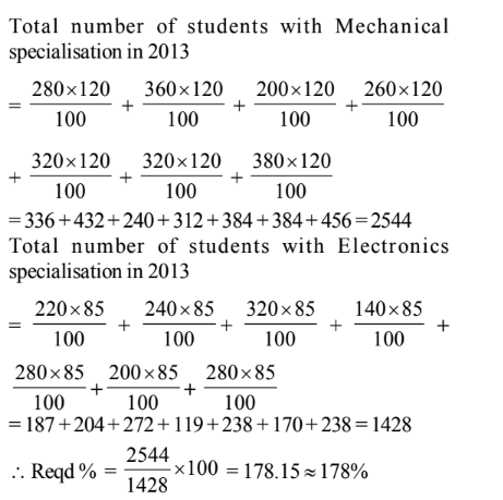 1. If the no. of students with Mechanical specialisation in each institute increased by 20% and the no. of students with Electronics specialisation in each institute decreased by 15% from 2012 to 2013, the total no. of students with Mechanical from all the institutes in 2013 is approximately what per cent of the total no. of students with Electronics specialisation from all the institutes in 2013?