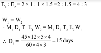 10. 45 men working 5 hours per day finish a piece of work in 12 days. In how many days can 60 women working 4 hours per day finish the same piece of work? 2 women do as much work in one hour as 1 man does in 1.5 hours.