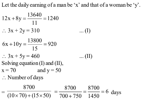 11. 12 men and 8 women can earn Rs.13640 in 11 days. 6 men and 10 women can earn Rs.13800 in 15 days. In how many days will 10 men and 15 women earn Rs.8700?