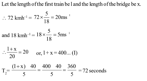 7. A train moving at the speed of 72 kmh–1 crosses a bridge in 20 seconds. Another train 40 metres shorter moving at the speed of 18 kmh–1 crosses the same bridge. Find the time taken by the second train to cross the bridge.