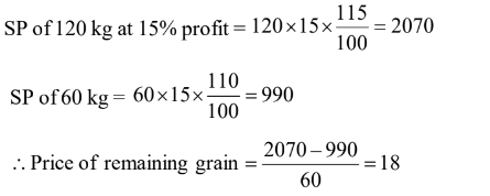 8. A shopkeeper purchased 120 kg of grain at the rate of Rs.15 per kg from a wholesaler. He sold 60 kg at the profit of 10%. At what rate per kg should he sell the remaining grain to earn a profit of 15% on the total deal?