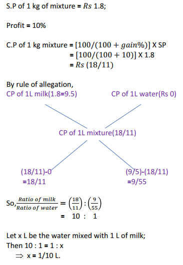 Q1. Riya buys milk at Rs 1.80 P per litre, mixes it with water and sells the mixture at the same price. How much water is added to each litre of milk if her profit is 10%?