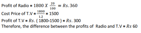 Q3. The profit percentage of Radio and T.V is same on selling the products at Rs 1800 each but profit of Radio is calculated on its Selling Price by mistake while the profit of T.V is calculated correctly on its Cost Price which is 20%. What is the difference between the profits of both the products?