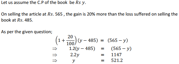 Q2. On selling an a book at Rs 565, the gain is 20% more than the loss incurred on selling it at Rs 485. In order to gain 20%,the selling price will be how much?