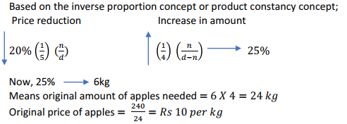 Q9. Due to reduction of 20% in the price of apples a customer can purchase 6 kg apples more for Rs 240. What is the original price of an apple?