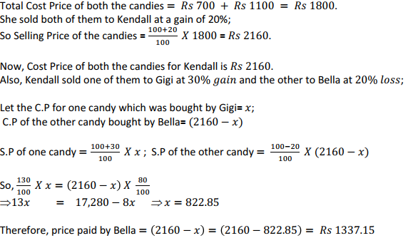 Q5. Kim bought two candies, one at Rs 700 and other at Rs 1100. She sold both of them to Kendall at a price so that she earns a gain of 20%. Kendall sold one of them to Gigi at 30% gain and another to Bella at 20% loss. At what price did Bella buy the carpet?