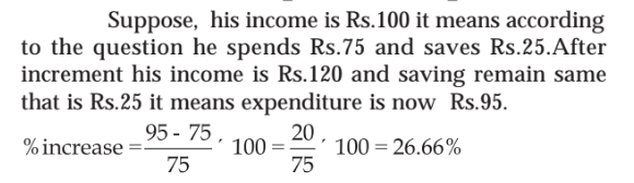 3. Vikas spends 75% of his income. His income is increased by 20% and saving remains same then what would be the increase in his expenditure?