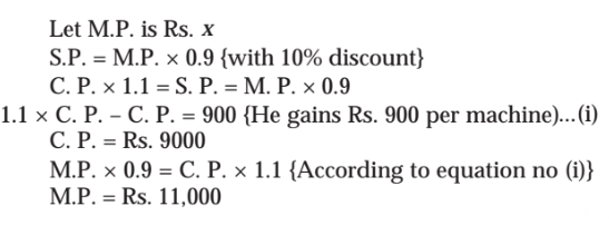 4. A manufacture offers a 10% discount on the market price of a machine and yet makes a profit of 10%. If he gains Rs. 900 per machine, what is the market price of each machine?