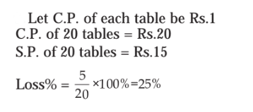 5. Cost price of 15 tables is equal to the selling price of 20 tables, then loss percent would be