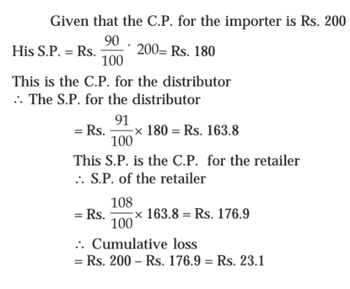 6. An importer of cereals got a consignment of coarse rice. He had to sell his goods at 10% loss to the distributor who sold it to the retailer at 9% loss. However, the retailer manages to sell it to the customer at 8% profit. If the cost price per kg is Rs 200, then what is the cumulative loss?