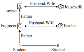 P, Q, R, S, T and X are members of a family. There are two married couples. Q is an engineer and the father of T. X is the grandfather of R and is a lawyer. S is the grandmother of T and is a housewife. There is one engineer one lawyer, one teacher, one housewife and two students in the family.