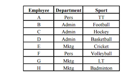 A, B, C, D, E, F, G and H are eight employees of an organization working in three departments, viz Personnel, Administration and Marketing with not more than three of them in any department. Each of them has a different choice of sports from football, cricket, volleyball, badminton, lawn tennis, basketball, hockey and table tennis, not necessarily in the same order. D works in Administration and does not like either football or cricket. F works in Personnel with only A, who likes table tennis. E and H do not work in the same department as D. C likes hockey and does not work in Marketing. G does not work in Administration and does not like either cricket or badminton. One of those who work in Administration likes football. The one who likes volleyball works in Personnel. None of those who work in Administration likes either badminton or lawn tennis. H does not like cricket.