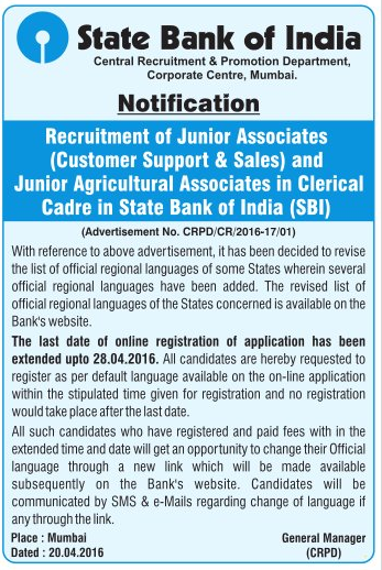 Hello and welcome to ExamPundit. SBI has extended the last date to apply SBI Junior Associates(Clerk) 2016 recruitment. They have issued a notification on Indian Express News paper this morning stating that the last is extended to 28th April, 2016.