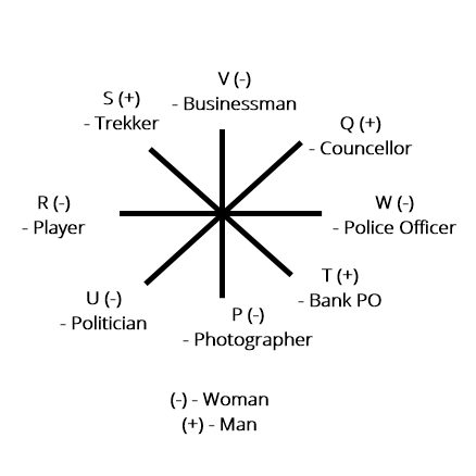 8 persons P,Q,R,S,T,U,V,W are seating around a table. Not more than three are female. They are from different professions- Trekker, Photographer, Politician, Bank PO, Counselor, Businessman,Player,Police officer. U is on the third left of the Police officer . W is neither a neighbour of V nor of P. Q is neither a PO nor a Trekker. R is facing neither politician nor S. T is facing the trekker. P is neither a Trekker nor a Counselor, but is one of the neighbours of U. V and P are facing each other but neither of them is a Player. The PO is facing a female. S is neither a neighbour of P nor facing the Politician. V and U are male. The business man is on the third left of the Politician and there are two person in between the Police officer and the Politician. The Player is facing the Police officer. Both the neighbours of W are female.