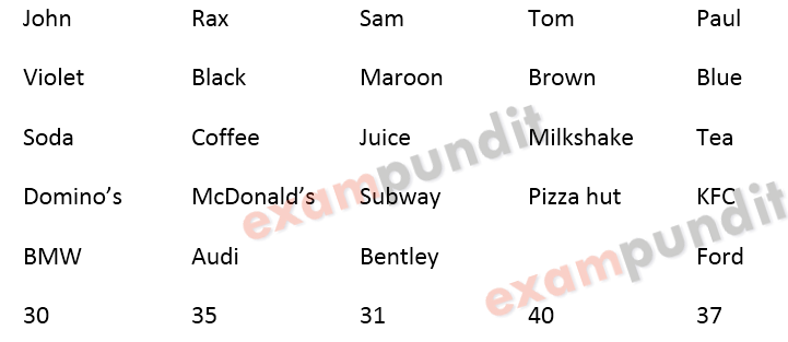 Five persons live in five flats of different colours. These flats are in a row. Each person prefers a different drink, drives a different car and eats different brand of snacks. Each persons is of different ages, from 30 to 40 years, including these two. Two ages are in the prime number, and one age is the multiple of 5 (except 30 & 40). Match the details. Paul drives Ford. The owner of Brown flat drinks milkshake. Sam lives in the Maroon colour flat. Rax drinks coffee. The Brown flat is next to the Blue flat. The difference between the ages of the one who lives in Black flat and the one who lives in Blue flat is same as the number of flats between them . The owner of violet flat eats Domino’s. The person who eats Subway drives Bentley. The person living in the center flat drinks juice. The one who drives Audi lives next to the one who eats Domino’s. John lives in the first flat. The one who eats McDonald’s lives next to the one who drives BMW. The one who eats Domino’s is the youngest. The one who lives in Brown flat, is to the left of the one who lives in Blue flat. The one who eats KFC drinks Tea. Difference between the ages of the one who lives in Maroon flat and the one who lives in Black flat is an even number. The person who eats McDonald’s has a neighbor who drinks Soda. Tom eats Pizza hut. John lives next to the Black flat. The one who lives in Black flat is younger than the one who drives Ford.